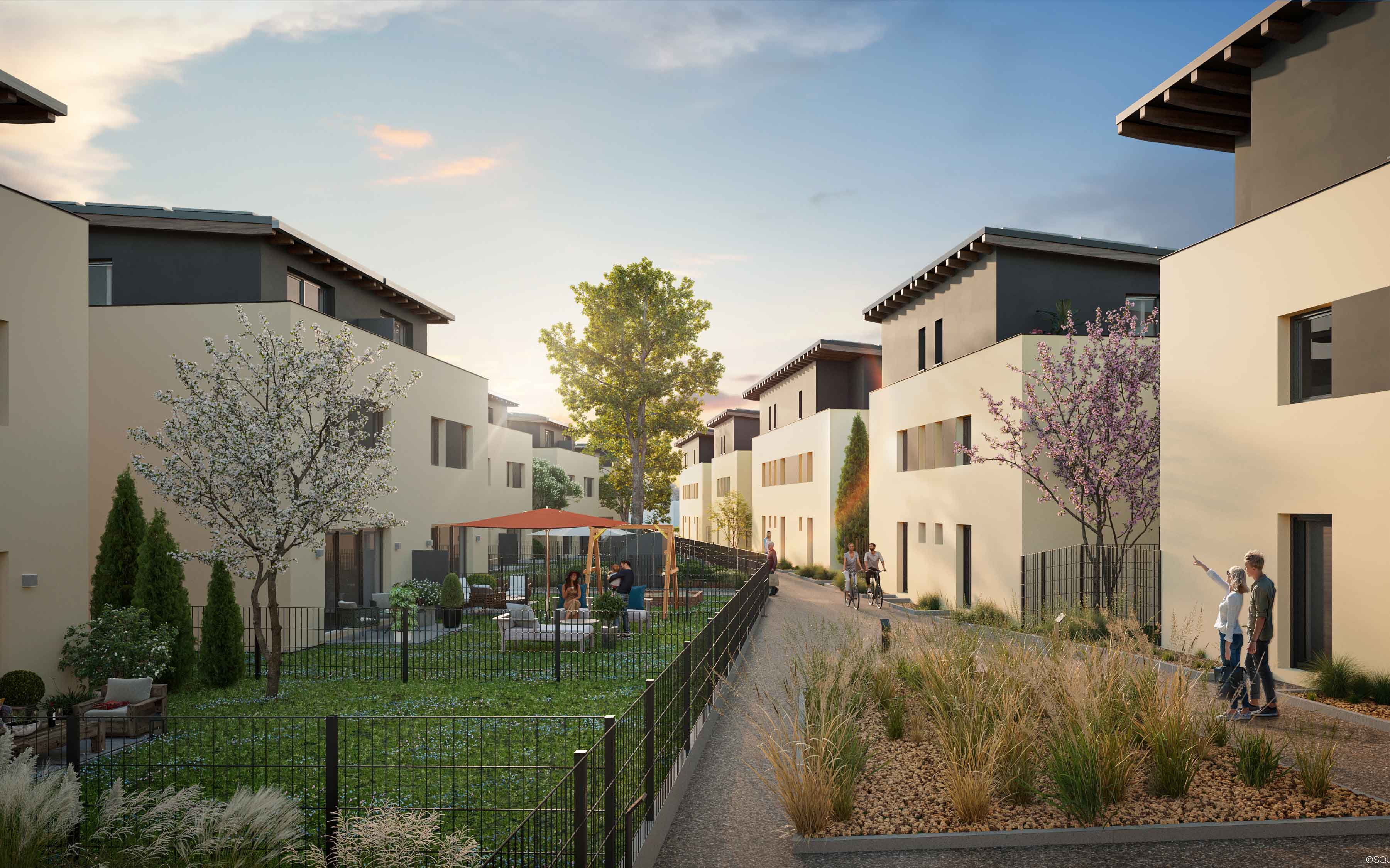 Der Platz zwischen den einzelnen Gebäuden wurde großzügig konzipiert, dass eine eigene Gartenlandschaft mit Bäumen, Sträuchern, Blumen und Wiesen entstehen kann. Natürlich wurde auch bei der Ausstattung darauf geachtet, dass die Häuser modernen Ansprüchen gerecht werden. Luftwärmepumpen sorgen für moderaten Energieverbrauch, eine eigene Photovoltaikanlage für grünen und günstigen Strom. Autos finden sich hier nur in der großzügigen Tiefgarage - zwei Abstellplätze (optional auch drei) sind für jedes Haus vorgesehen.